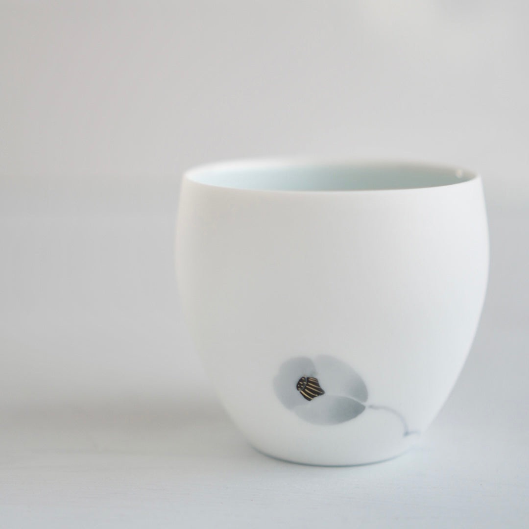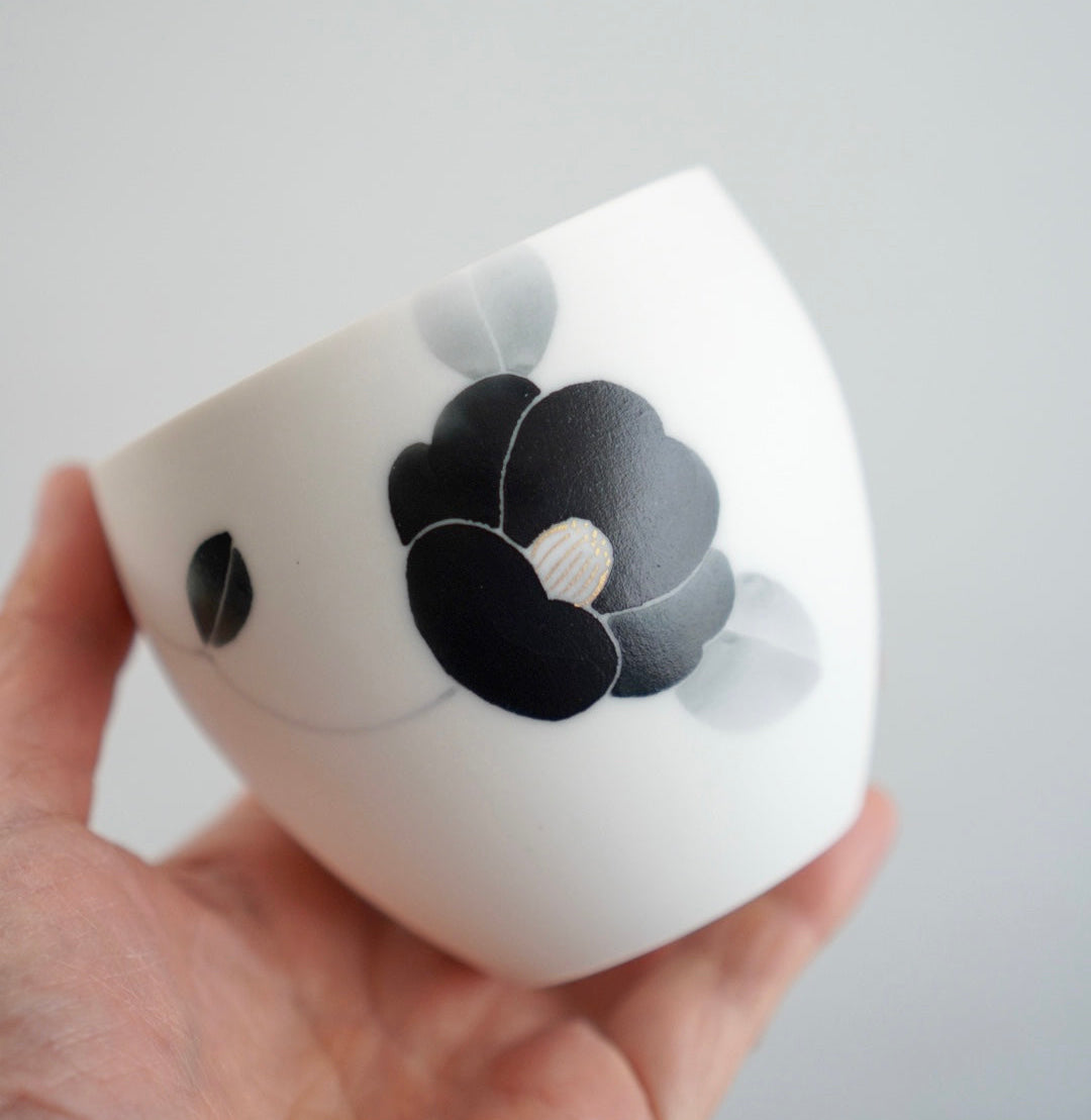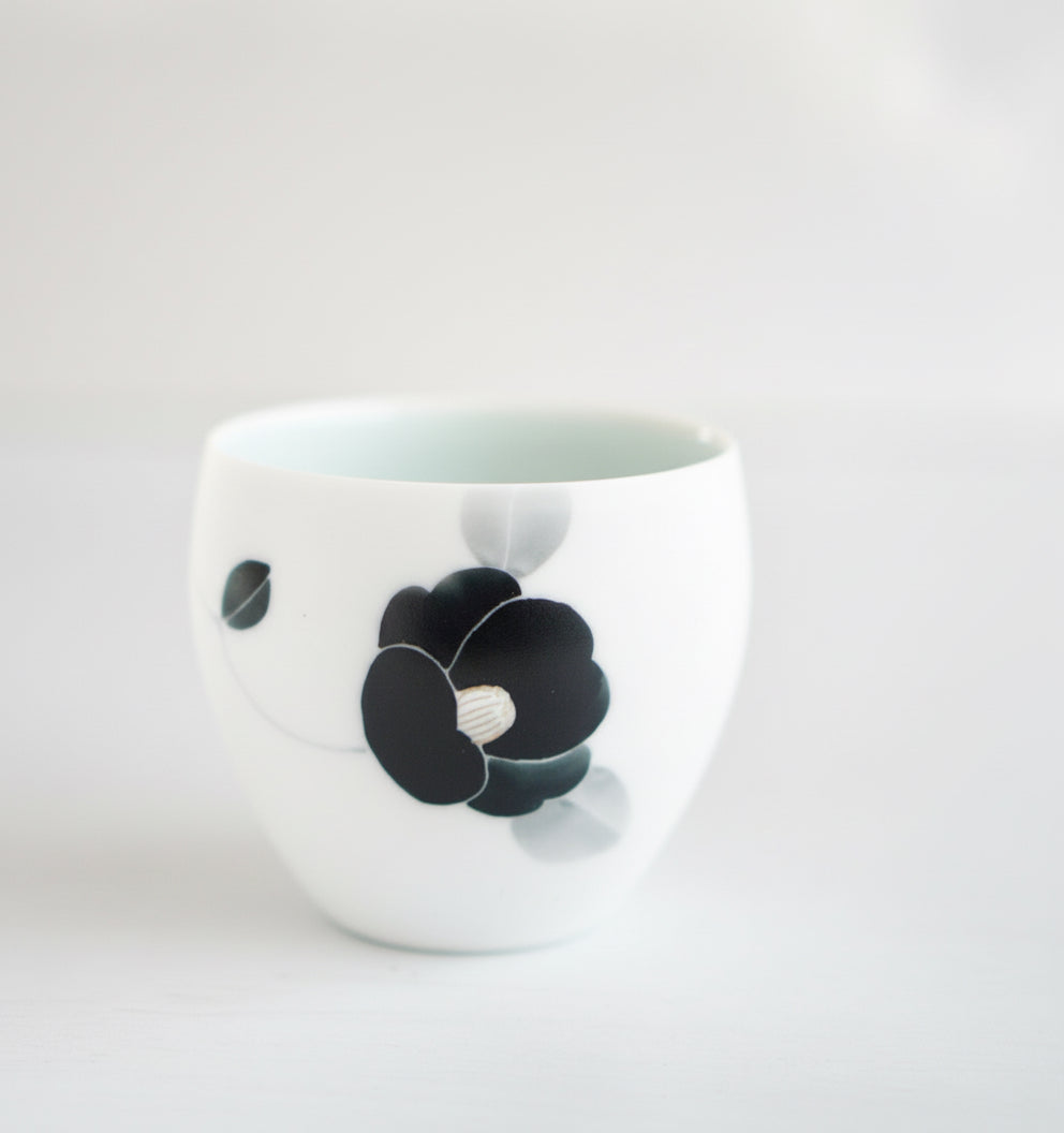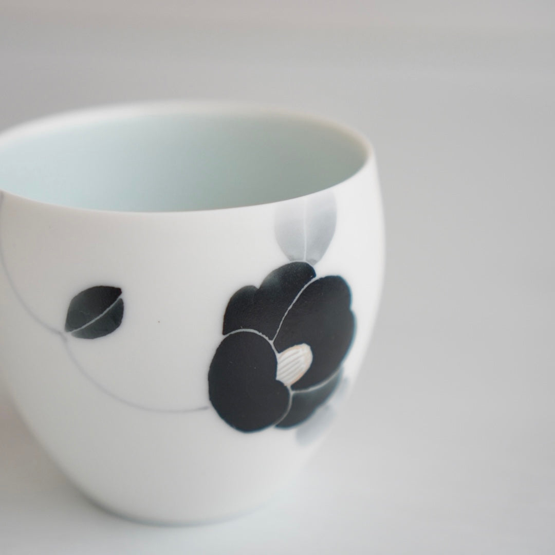 真っ白な白磁の素地に、黒の呉須で椿を描いた “墨黒シリーズ” のカップ。表と裏の両面に咲く椿が、手描きならではの表情を添えています。
