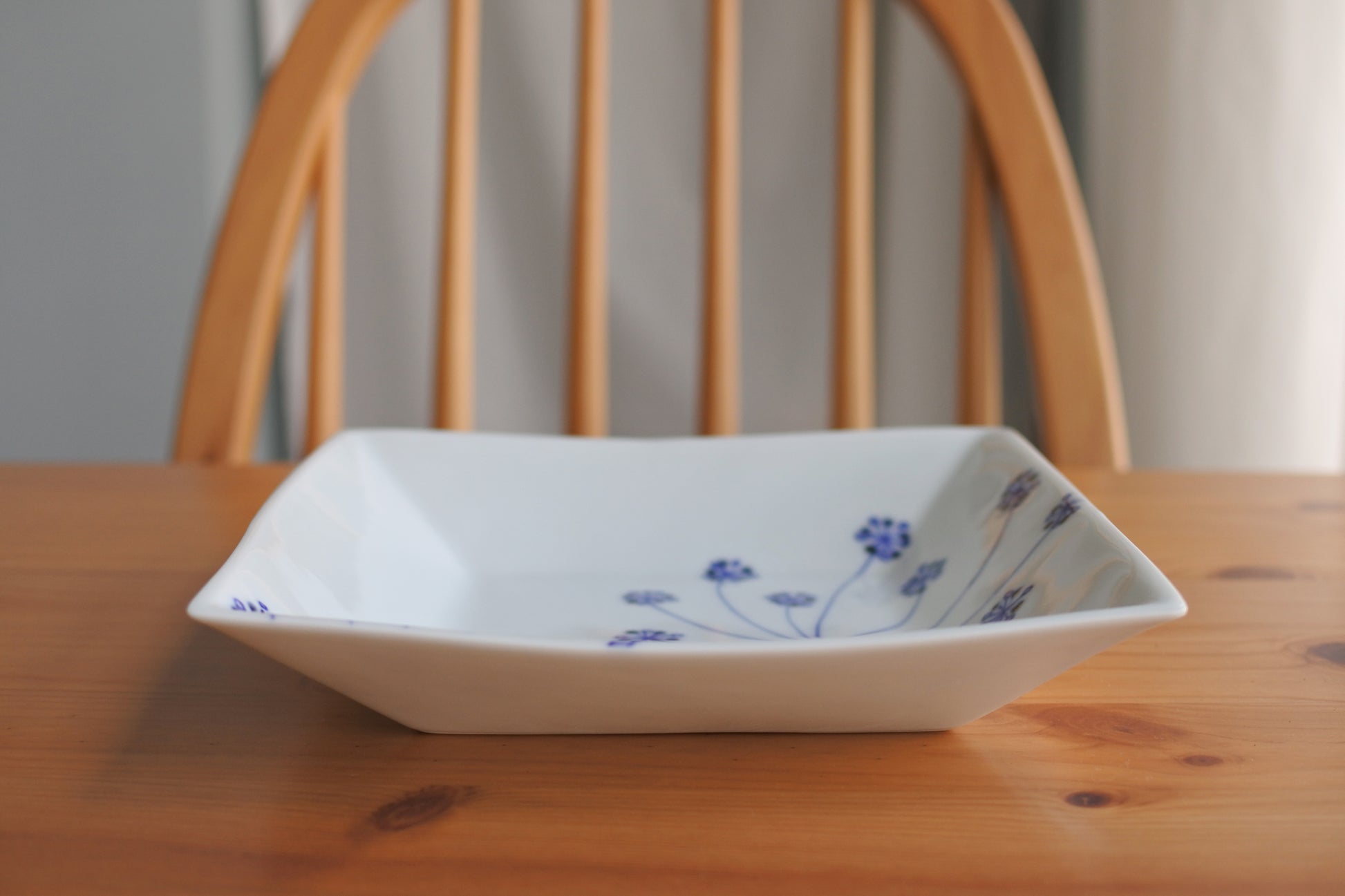 A charming plate decorated with lace flowers, each one hand-painted in the traditional sometsuke style.