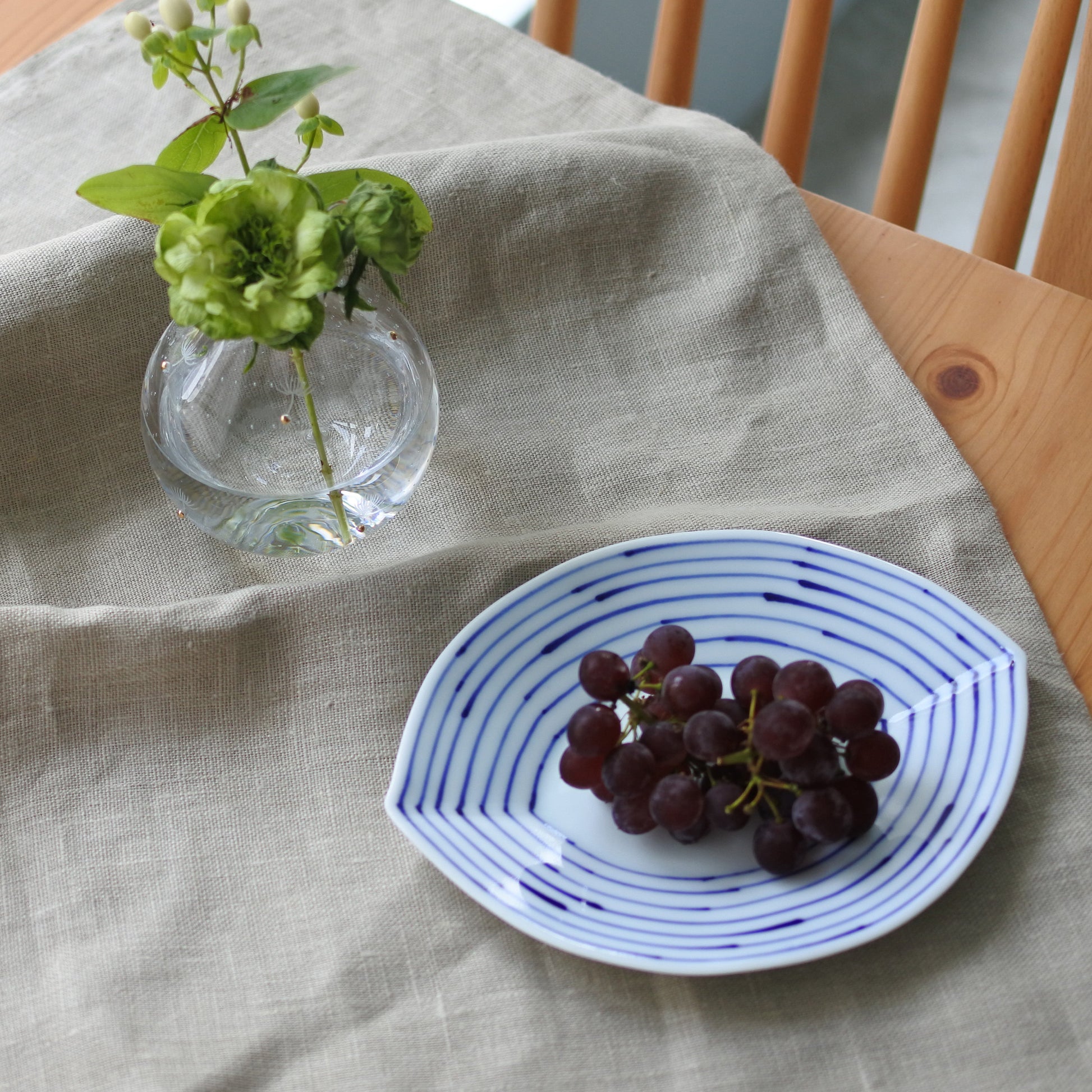 A leaf-shaped plate featuring hand-painted blue lines that create a refreshing and elegant impression.
