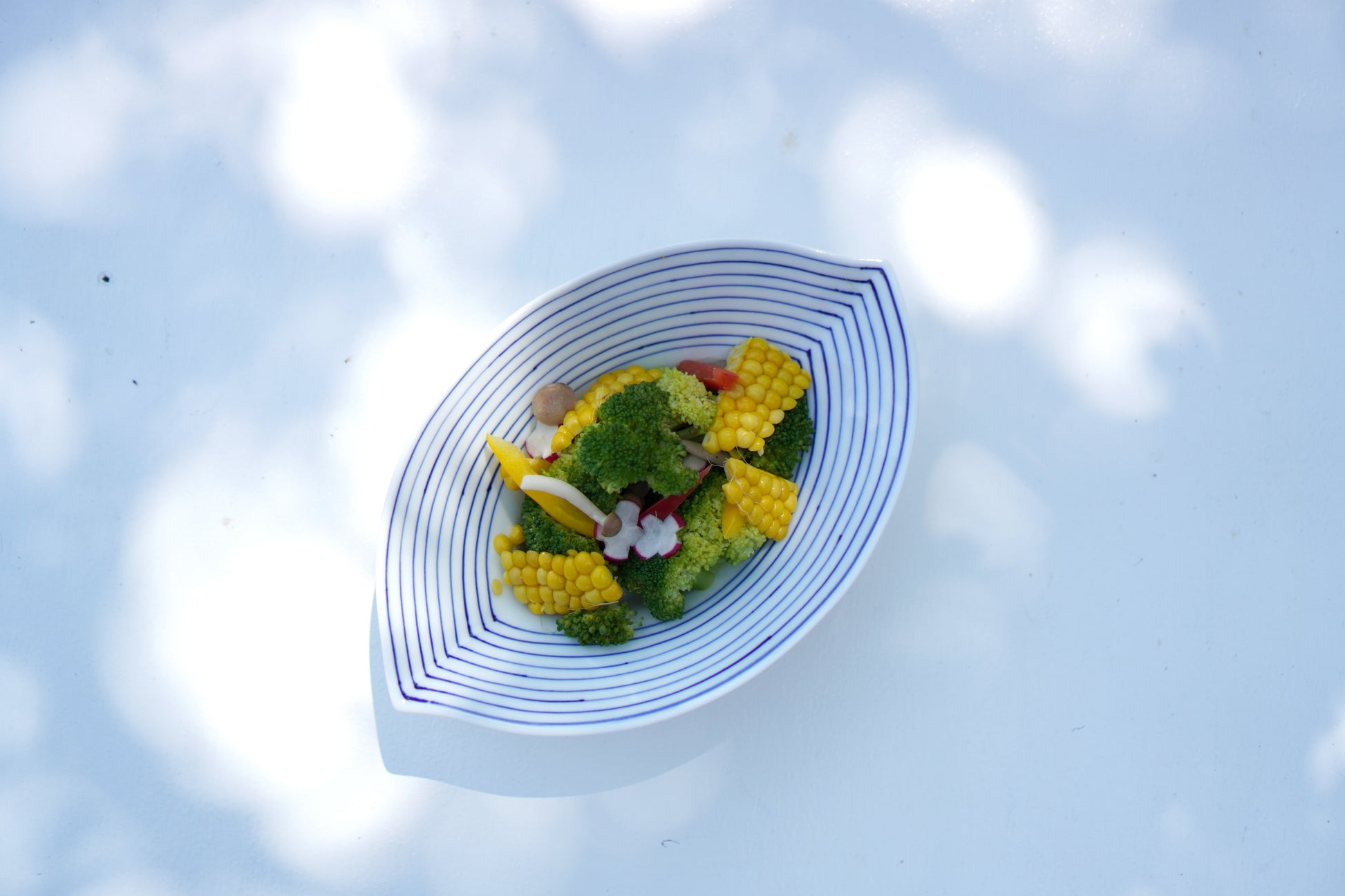 A leaf-shaped bowl featuring hand-painted blue lines that give a refreshing and elegant impression.