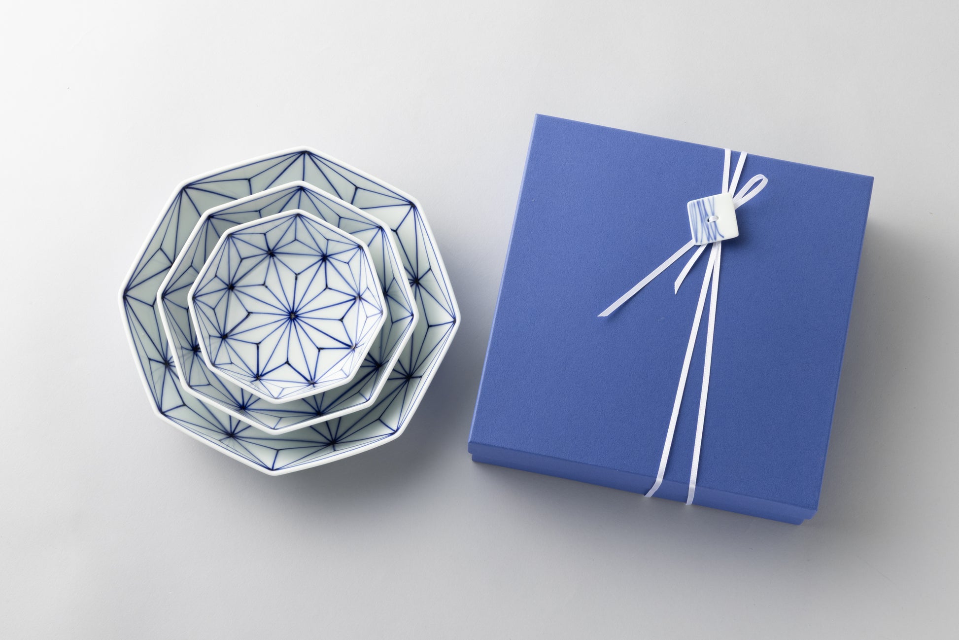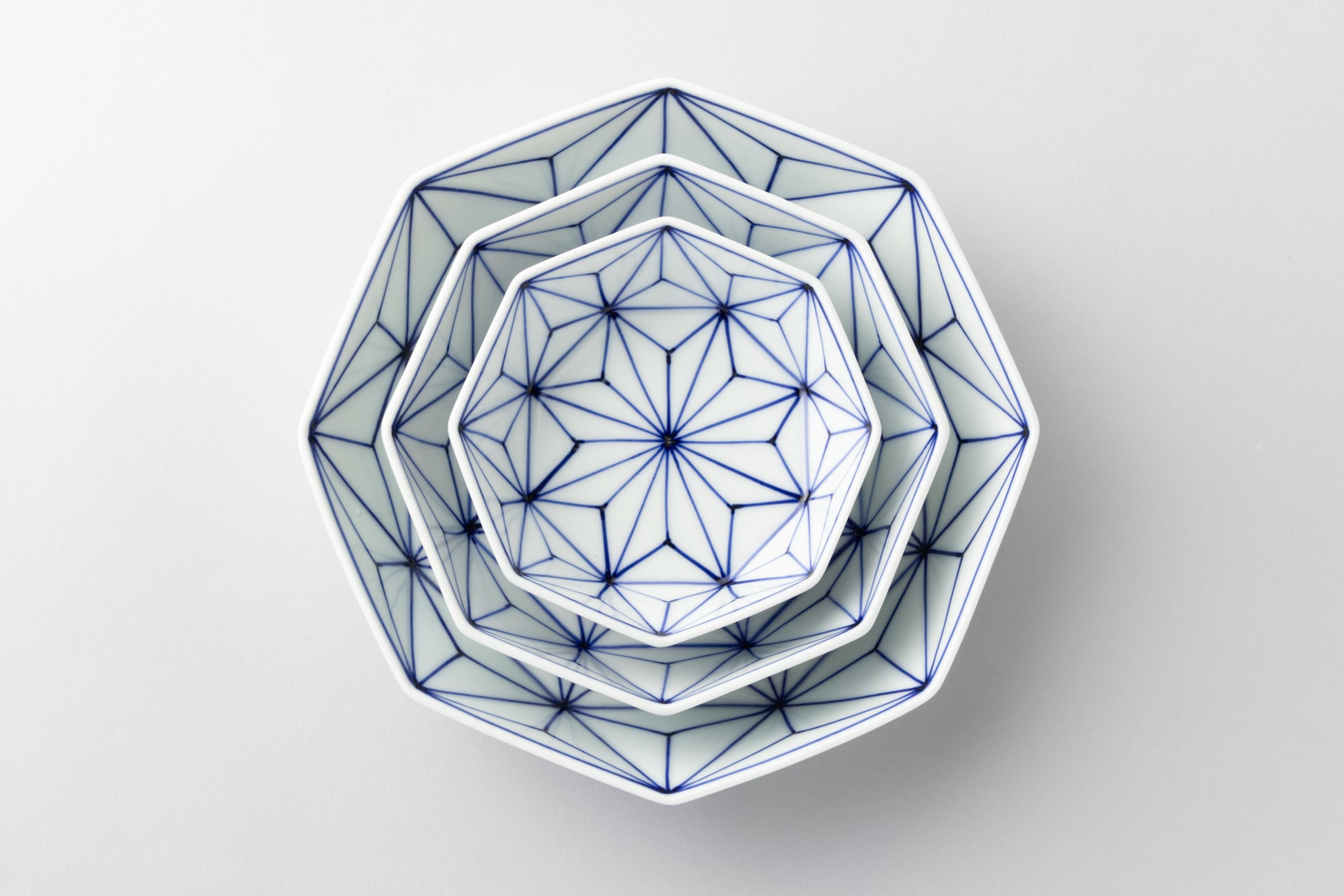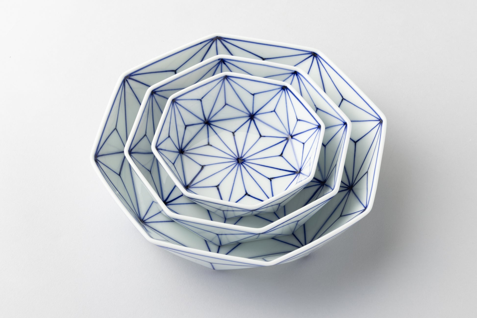 日本の伝統文様「麻の葉」を染付であしらった、眞窯の鉢セットです。