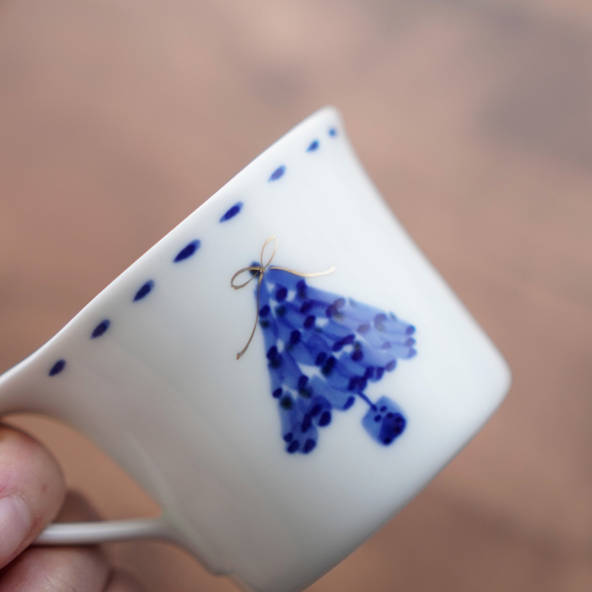 裏と表で異なるデザインのツリーがあしらわれたマグカップです。落ち着いたブルーとゴールドのみを使用した上品なデザインで、ホリデーシーズンにはもちろん、クリスマス以外のシーンでも活躍します。