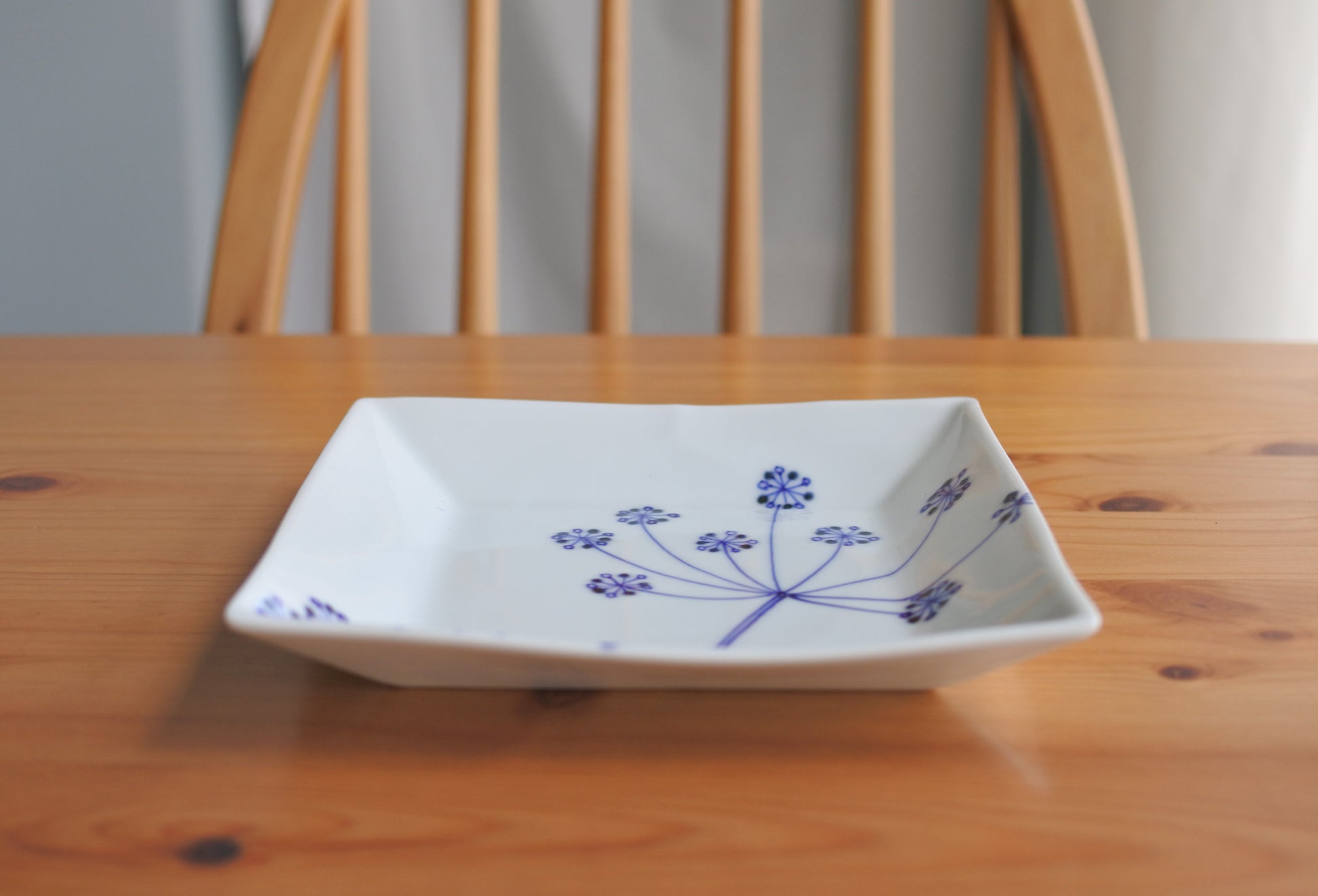 染付でひとつひとつ描かれたレースフラワーがかわいいお皿です。