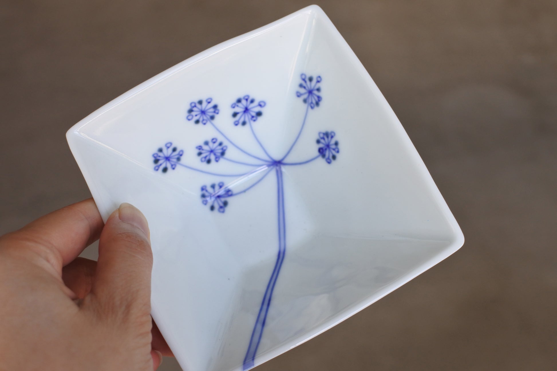 染付でひとつひとつ描かれたレースフラワーがかわいいお皿です。