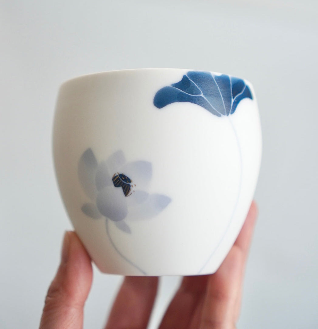 真っ白な白磁の素地に、染付のハスを描いたカップです。