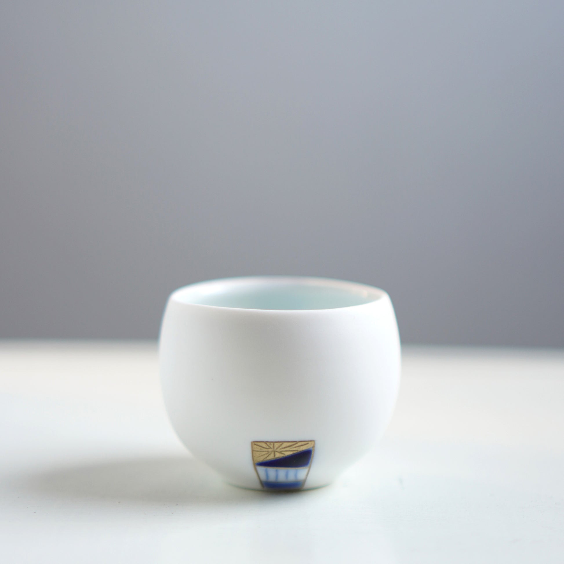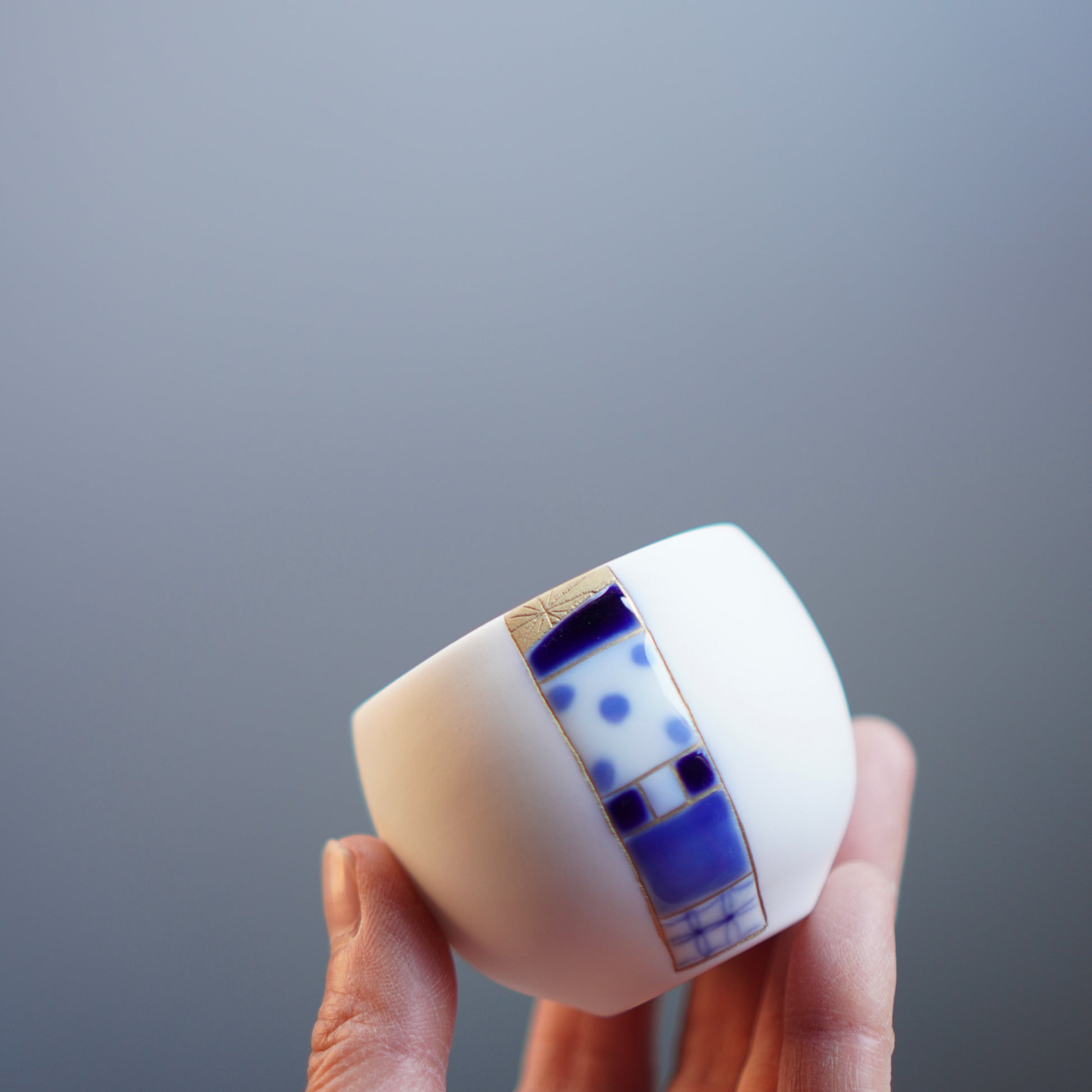 落ち着いたマットな質感の素地に、帯のように絵柄を施した「Obi」のぐいのみ。