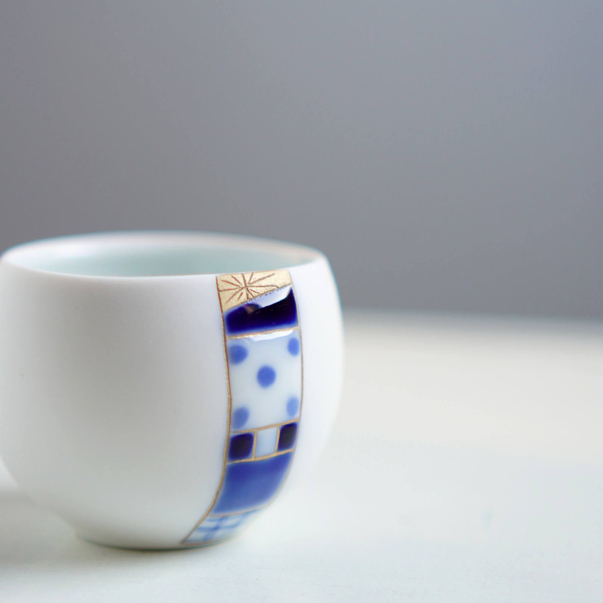 白地に鮮やかなブルー、そこに金色が加わることで、華やかさと上品さを併せ持つ贅沢な印象になっています。